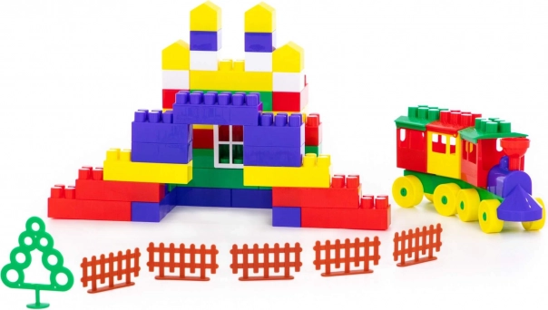 Setul include o gamă largă de blocuri de diferite culori care susțin dezvoltarea creativității la copii.