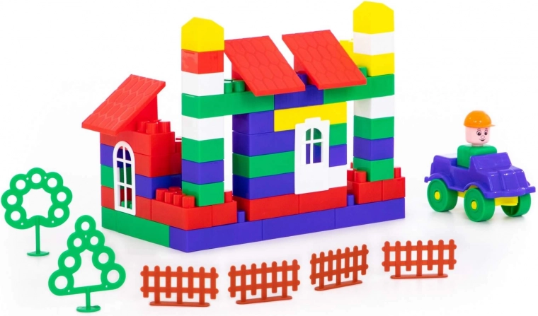 Include diverse forme precum case, copaci și garduri pe care copiii le pot asambla conform imaginației lor.