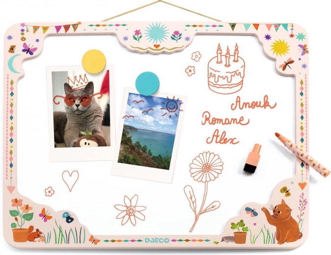 Tablă magnetică stilată cu motiv de pisică de la DJECO pentru camere de copii și săli de joacă. Are ramă din lemn, suprafață metalică pentru scris/magnetică, șnur colorat pentru agățare și marker uscat cu capac magnetic. Excelentă pentru desen, scriere de mesaje și prinderea magneților.