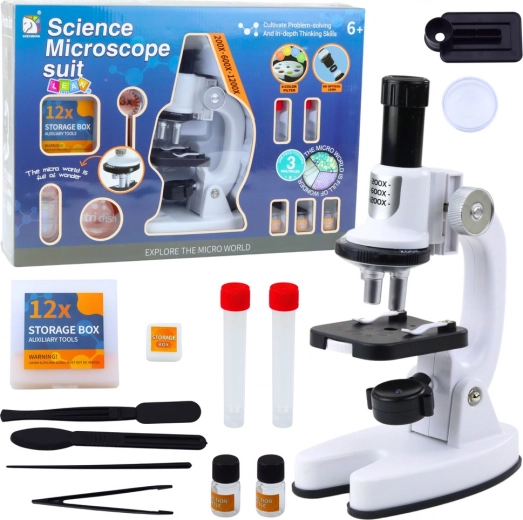 Setul include o serie de instrumente esențiale – pipetă, pensetă, mostre, sticle, containere și lamele de sticlă, care permit efectuarea diverselor experimente și observații interesante. Totul este ambalat într-o carcasă solidă, ceea ce face microscopul un cadou ideal.