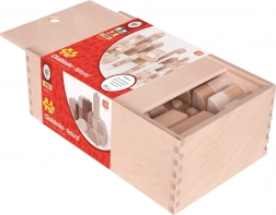 Setul de construcție este realizat din lemn durabil cu suprafață netedă pentru joacă în siguranță. Cutia practică din lemn cu capac culisant facilitează depozitarea și ordinea în camera copilului.