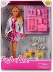 Deveniți o veterinară cu păpușa Lucy și drăgălașii săi căței. Set complet cu halat alb și accesorii pentru examinarea pacienților animali.