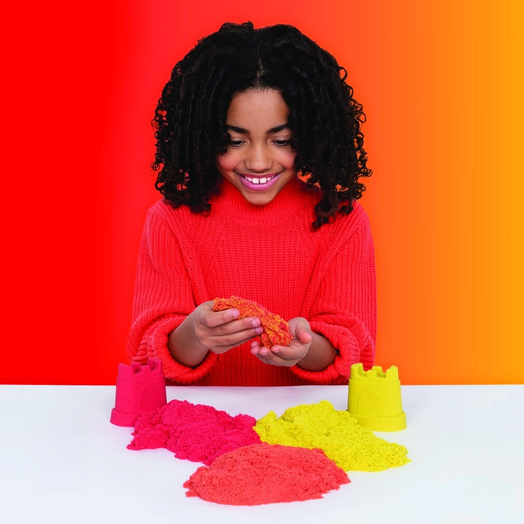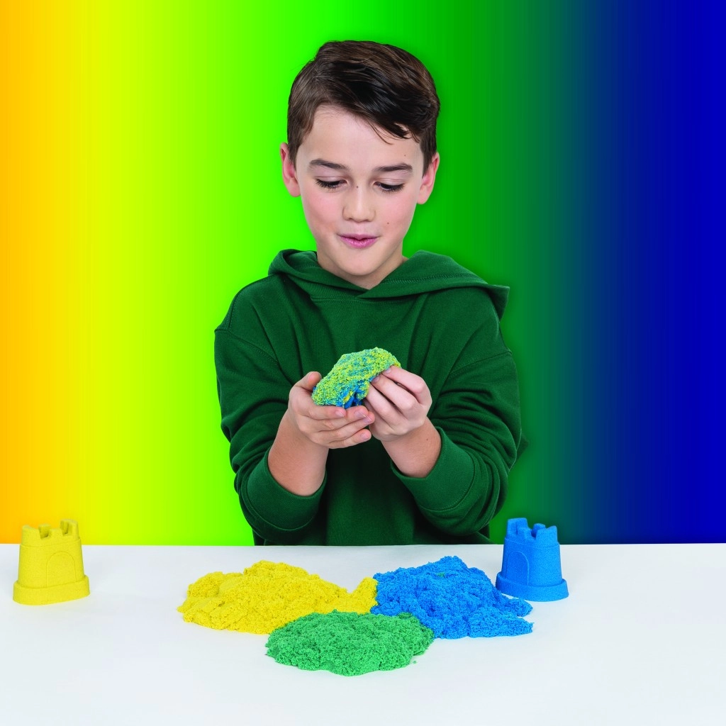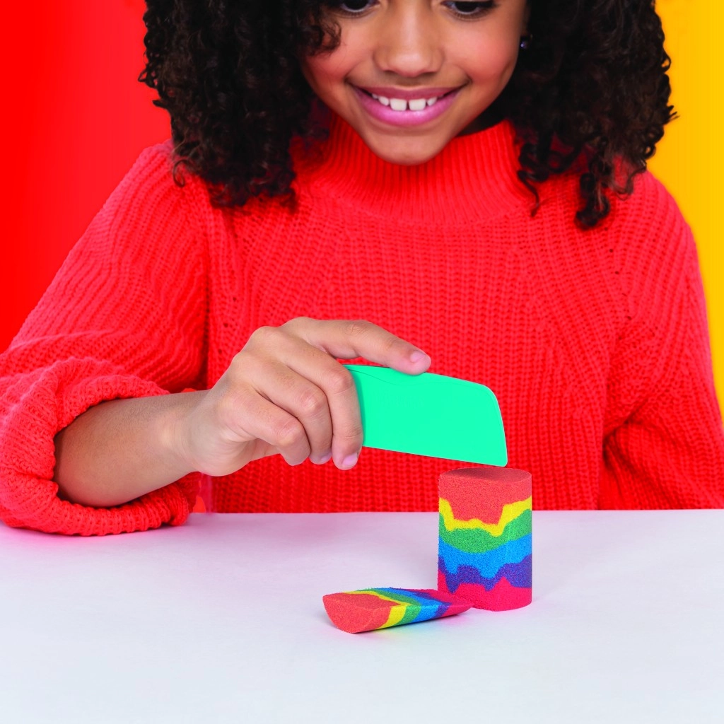 Acest set combină nisipul iconic Kinetic Sand cu instrumente practice pentru tăiere, amestecare și modelare. Creați curcubee realiste, stratificați culorile și construiți castele viu colorate – nisipul își păstrează forma, nu se lipește și este plăcut la atingere.