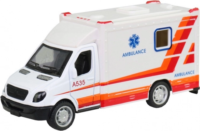 Ambulanță metalică realistă cu dimensiune de 10 cm, mers înapoi și uși deschise. Jucărie ideală pentru mici salvatori.