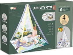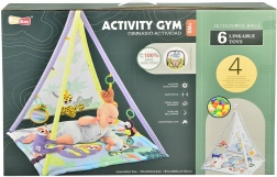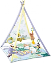 Acest covoraș cu cort în culori contrastante atrage nu doar prin estetică, ci și prin funcționalitate. Este destinat distracției și educației copiilor și este echipat cu muzică și alte accesorii: