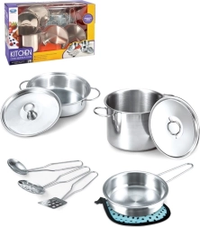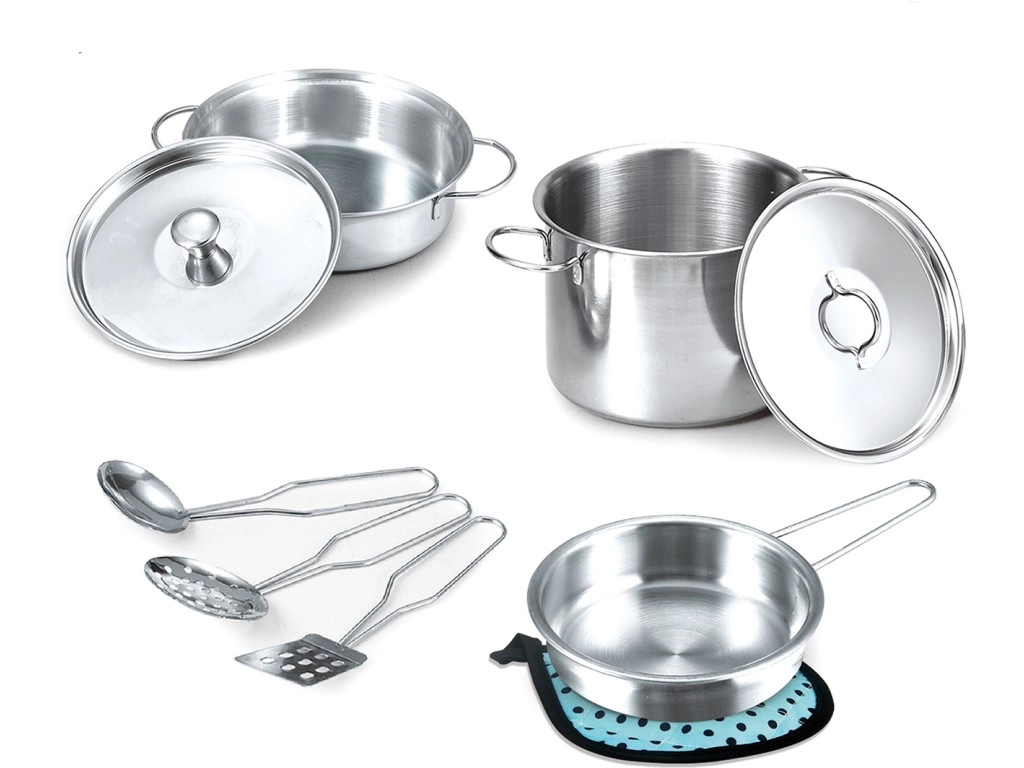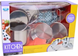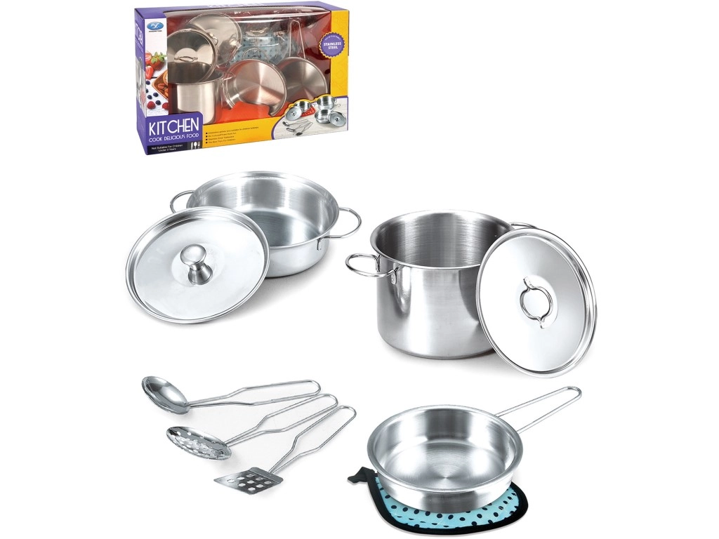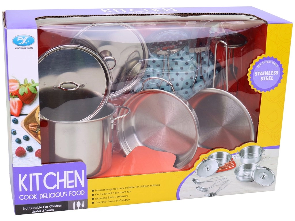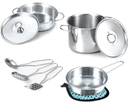 Acest set de veselă din oțel inoxidabil conține nouă piese care extind posibilitățile jocurilor copiilor în bucătărie. Arătați-le copiilor dumneavoastră cum să gătească cu acest set minunat. Vesela este fabricată din tablă, ceea ce o face sigură și durabilă pentru joaca copiilor. Ambalajul de tip window box asigură că setul va arăta grozav încă de la prima vedere.