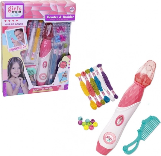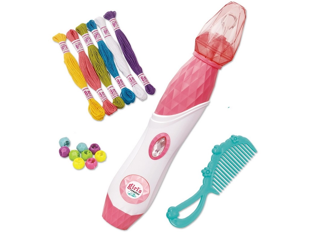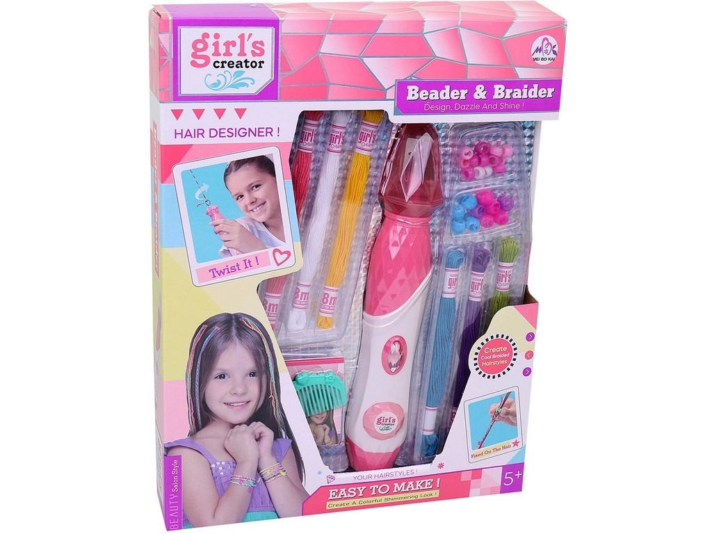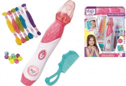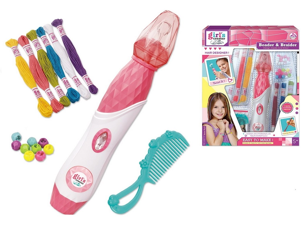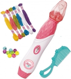 Acest set de mărgele pentru decorarea părului include tot ceea ce copilul tău are nevoie pentru a crea coafuri originale. Utilizarea este simplă – ațele se fixează pe păr și cu ajutorul butonului diamantat șuvița de păr se răsucește. Apoi fixezi ușor capătul șuviței cu o mărgea și noua coafură este gata.