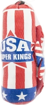 Set distractiv și sigur pentru micii sportivi: sac de box pentru copii cu mănuși, cu motivul steagului american. Ideal pentru consumarea energiei, dezvoltarea coordonării și activitate prin joacă. Ușor și compact, ușor de transportat și potrivit de la 3 ani.
