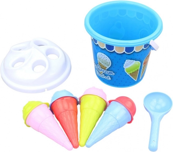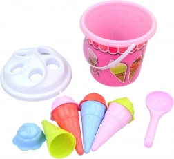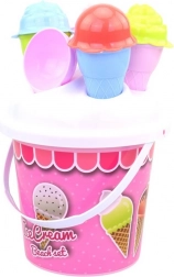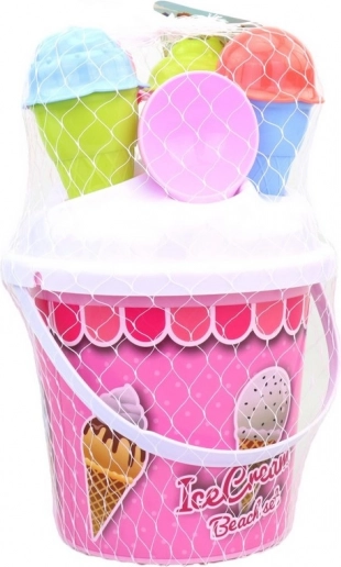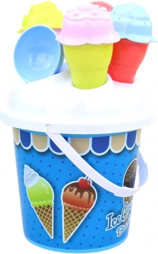 Setul include o găleată cu mâner pentru o manipulare ușoară și transport pe plajă sau în locul de joacă cu nisip. Găleata este decorată cu grafice atractive de înghețată.