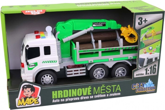 Mașină pentru transportul lemnului cu braț ridicător și efecte luminoase și sonore este un cadou perfect pentru fiecare mic admirator al mijloacelor de transport.