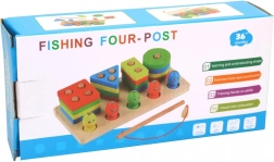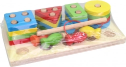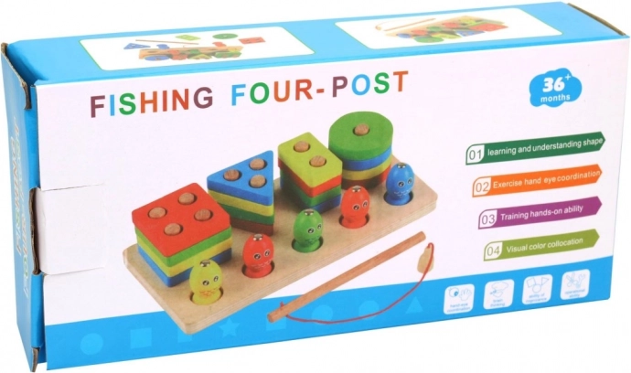 Această jucărie din lemn oferă două jocuri diferite care ajută la dezvoltarea răbdării și concentrării copiilor dumneavoastră. Prima parte constă în forme geometrice în culori de bază, care trebuie plasate corect în spațiile desemnate. A doua parte aduce distracție prin prinderea peștișorilor colorați folosind o undiță magnetică. Ambele jocuri contribuie la dezvoltarea motricității fine și a coordonării ochi-mână.