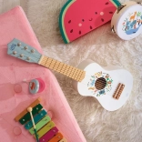 Această chitară nu doar că arată frumos, dar este și un instrument funcțional pentru dezvoltarea copiilor. Cu ajutorul ei, copiii se pot simți ca adevărați muzicieni și pot învăța abilități importante precum motricitatea fină și coordonarea mână-ochi.