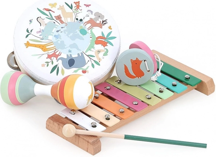 Acest minunat set muzical include tot ce aveți nevoie pentru a oferi copiilor primii pași în lumea muzicii, distracției și fanteziei. Conține tamburină, xilofon cu baghetă, maracas duble și castaniete. Nu sunt instrumente muzicale, ci doar jucării care ajută copiii să dezvolte dragostea pentru muzică și ritm.