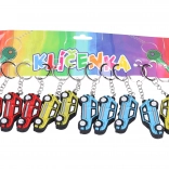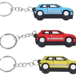 Un breloc la modă în formă de mașină, disponibil în trei culori vii: roșu, galben și albastru.