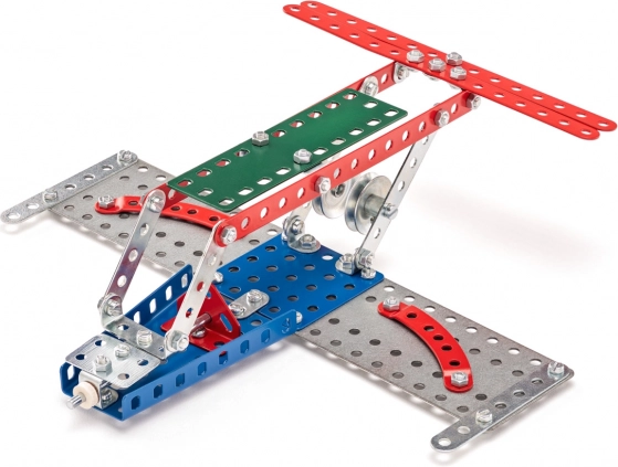 Set de construcție MERKUR oferă posibilitatea de a construi până la 10 modele diferite de tehnică aeronautică, ceea ce o face alegerea ideală pentru micii pasionați de aviație. Această construcție stimulează creativitatea și dezvoltă abilitățile motorii fine ale copiilor.