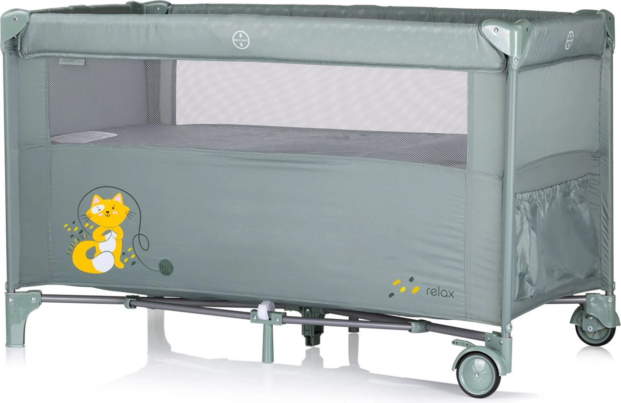 Patul pentru copii Relax este soluția perfectă pentru părinții care doresc să aibă bebelușul aproape chiar și noaptea. Datorită lateralei rabatabile și celor două niveluri diferite, permite o plasare simplă și sigură lângă patul dumneavoastră. Roțile practice cu frână permit mutarea ușoară a patului în cameră.