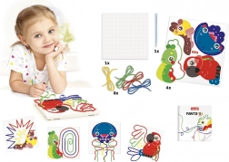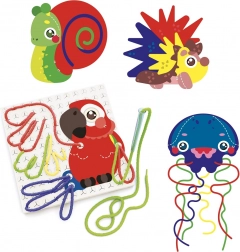 Setul include patru forme din carton cu animăluțe (de ex. papagal, arici, melc, meduză) și opt șireturi colorate, care inspiră la creație și combinarea de modele.