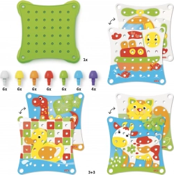 Pachetul include o bază din plastic, trei cartonașe ilustrate pe ambele fețe și în total 40 de pini colorați. Copiii pot aranja după modele sau pot crea propriile imagini – o distracție care crește odată cu ei.