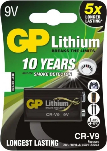 Bateriile GP Lithium 9V sunt alegerea ideală pentru dispozitivele care necesită performanțe constante și pe termen lung. De obicei, acestea sunt dispozitive de uz casnic, cum ar fi detectoarele de fum, care, cu aceste baterii, rămân active până la zece ani dacă sunt utilizate împreună cu o baterie de rezervă. Aceasta este de două ori mai mult decât durata de viață a bateriilor alcaline obișnuite.