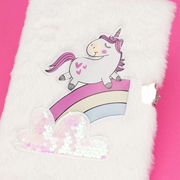 Jurnalul are o copertă extra moale și pufoasă, decorată cu un unicorn opalescent și paiete reversibile perlate. Acest aspect unic este ideal pentru cei care adoră accesoriile magice și colorate.