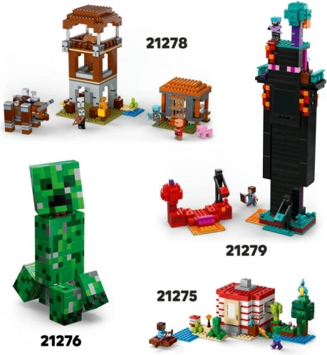 Sunt incluse personaje și mobi iconici din MINECRAFT: Alex, un miner, un păianjen cu loc pentru călăreț, un schelet–arcas și un drăgălaș pui de urs polar. După joacă, modelul în formă de târnăcop devine o piesă de expoziție spectaculoasă pentru camera copilului.