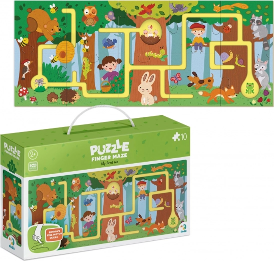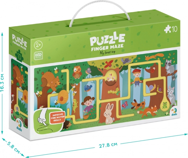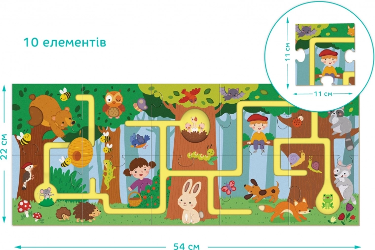 Acest puzzle grozav oferă o formă jucăușă de descoperire a pădurii, unde copiii pot urma cu degetul canelurile și parcurge o rută drăguță plină de veverițe, iepurași, arici și păsărele. Ilustrațiile adaugă farmec întregului proces și copiii pot învăța să recunoască animalele din pădure. Puzzle-ul este conceput pentru a dezvolta motricitatea fină, coordonarea, atenția și imaginația celor mici.