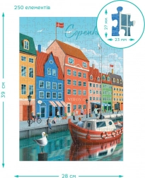 Puzzle DODO Orașe: Copenhaga oferă posibilitatea de a trăi magia unuia dintre cele mai frumoase orașe din lume. Asamblarea acestor 250 de piese vă va oferi ore de distracție și relaxare, în timp ce veți fi aproape de a finaliza o imagine splendidă.
