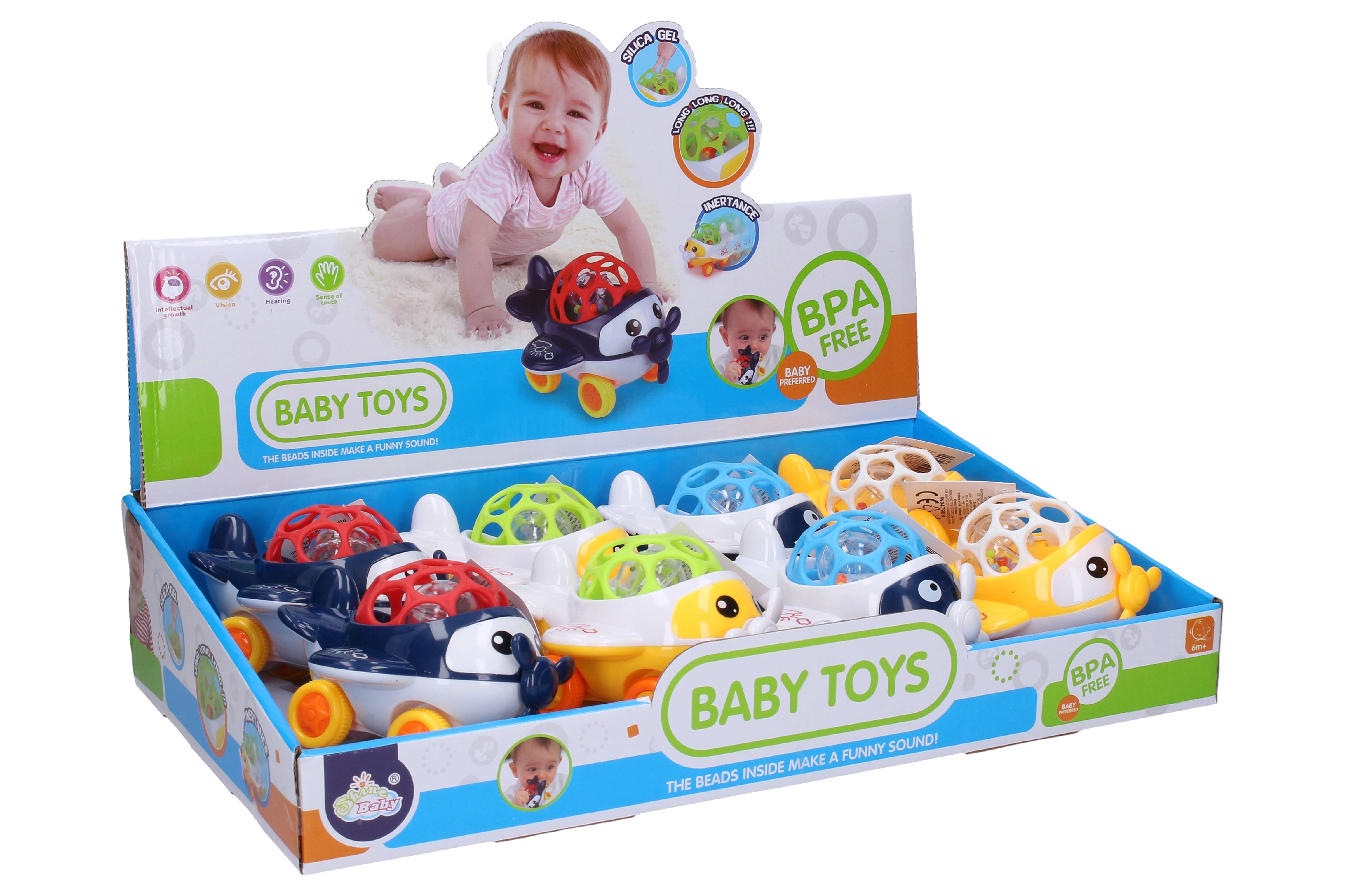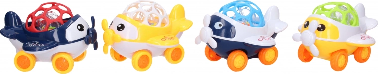 Jucărie în formă de avion cu roți libere, perfectă pentru distracția și dezvoltarea copiilor. Aceste zornăitori sunt disponibile în patru variante de culori: albastru, verde, alb și roșu. Datorită dimensiunii sale de 11x11x8 cm, este ușor de prins și manevrat de către copii.
