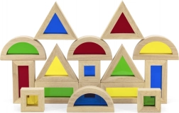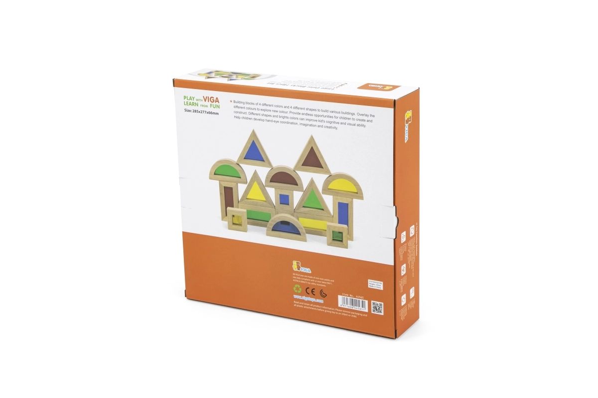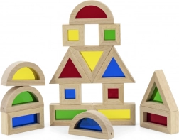 Acest set de 16 cărămizi din lemn atent finisate, cu inserții transparente colorate, oferă posibilități nesfârșite de construit, sortat și explorat lumina și culorile. Copiii pot ridica turnuri, căsuțe sau poduri, dezvoltând în același timp percepția spațială și gândirea logică.