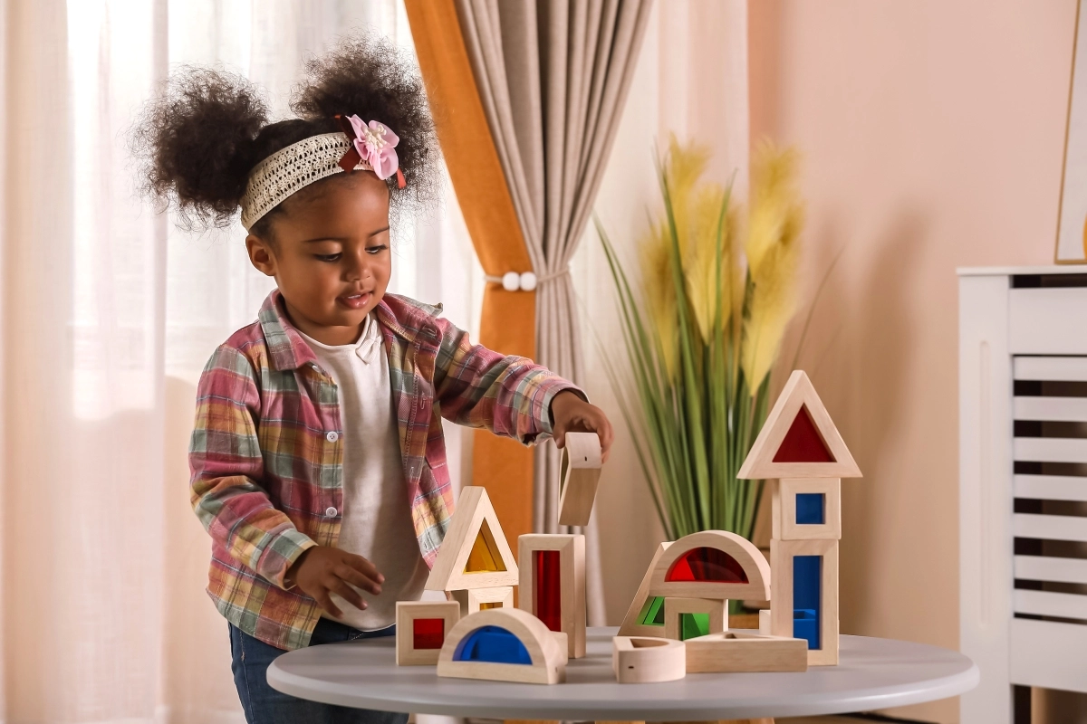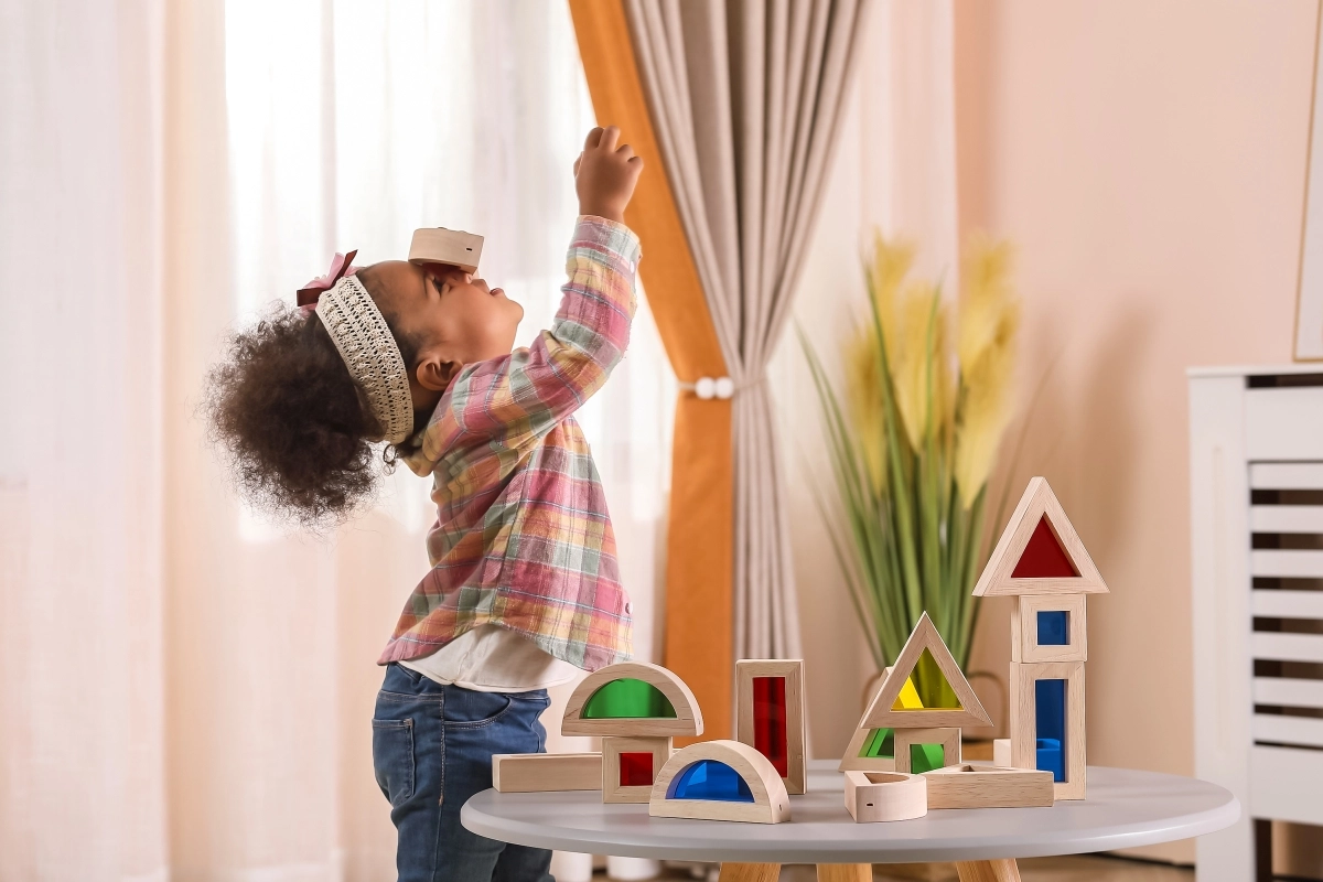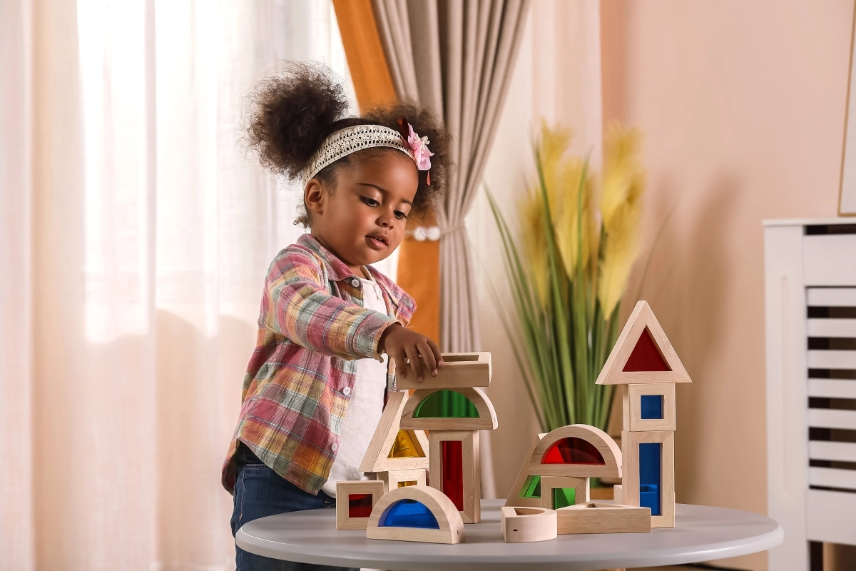 Triunghiuri, pătrate, dreptunghiuri și semicercuri care dezvoltă reprezentarea spațială și construcții stabile prin suprapunere și aranjare.