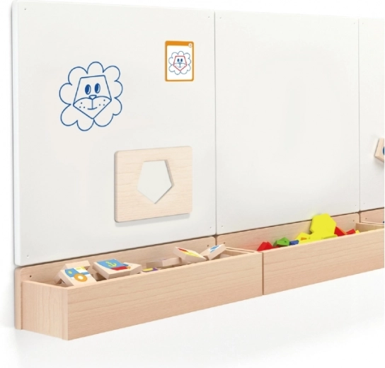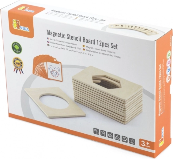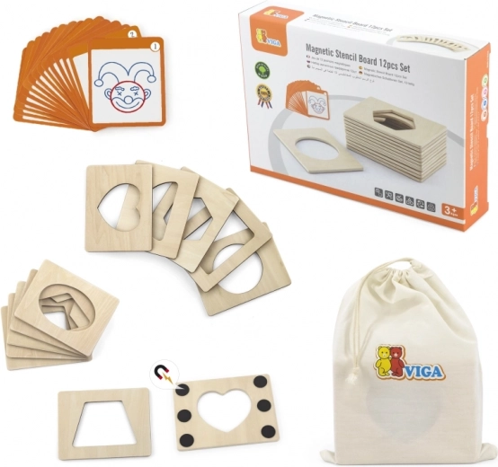 Acest set unic conține 12 bucăți de șabloane din lemn, care sunt ideale pentru copii de la 3 ani în sus. Fiecare șablon are un suport magnetic care facilitează manipularea și asigură că rămâne la locul său.