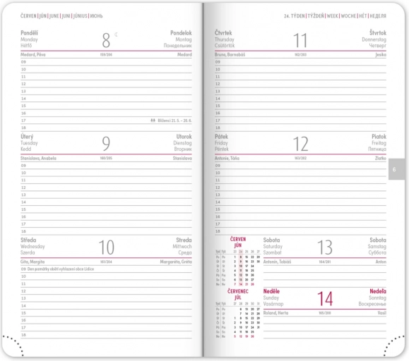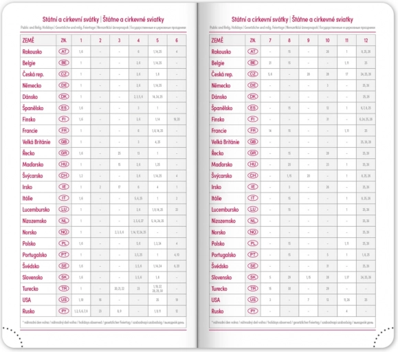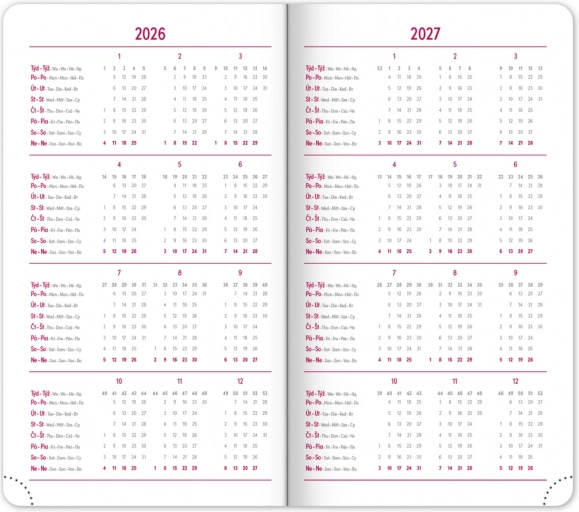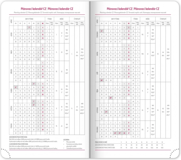 Descoperiți practicitatea și eleganța agendei de buzunar, partenerul ideal pentru fiecare zi. Agenda oferă un orar săptămânal cu calendar ceho-slovac și limbi suplimentare: engleză, germană, maghiară și rusă. Bucurați-vă de confort datorită: