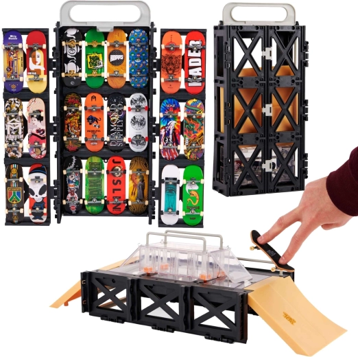 Tech Deck Play and Display este o soluție inteligentă 2 în 1: suport și husă de depozitare pentru colecția ta și skatepark complet pentru fingerboard pentru trick-uri. Construcția tip ladă se desface ușor într-un funbox cu rampe și grind rails, astfel încât poți rula acasă sau în deplasare. Include și un fingerboard stilat ELEMENT pentru mers imediat.