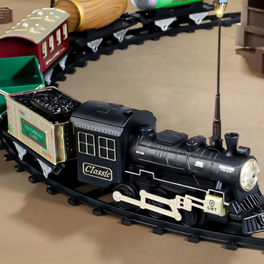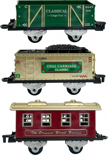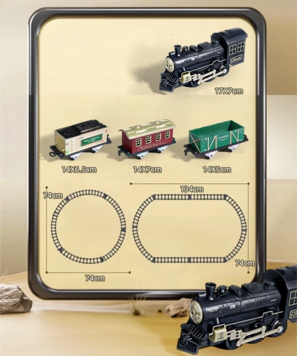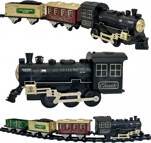 - locomotivă cu lumină și sunete, vagon de pasageri, tender de cărbune, vagon de marfă, 10 piese de șină (4 drepte, 6 curbe)
