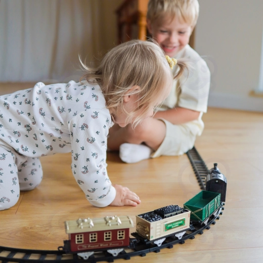 Locomotiva luminează și redă sunete fidele unei locomotive cu aburi, făcând jocul captivant și distractiv.