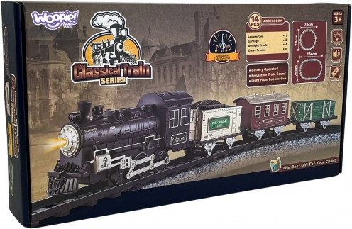 Acest set tradițional cu aburi oferă copiilor o experiență autentică de călătorie cu trenul. Locomotiva are far luminos și sunete realiste, ceea ce amplifică atmosfera de joc. Șinele se fixează ușor, astfel încât poți construi în câteva clipe un circuit cu diametrul de 74 cm sau un oval de 134 × 74 cm.
