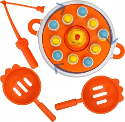 - 4 în 1 (pescuit cu undița, catapultă cu prins, disc muzical rotativ, puișor‑mașinuță)