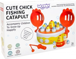 Această jucărie versatilă îmbină până la patru jocuri într-un singur set, astfel încât copiii nu se vor plictisi ușor. Baza rotativă cu muzică ridică aleatoriu puișorii, care pot fi pescuiți cu undița magnetică sau prinși cu paletele după lansarea din catapultă. Puiul mai mare, detașabil, poate fi folosit ca mașinuță jucăușă.