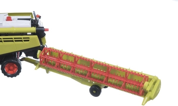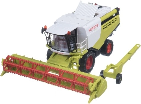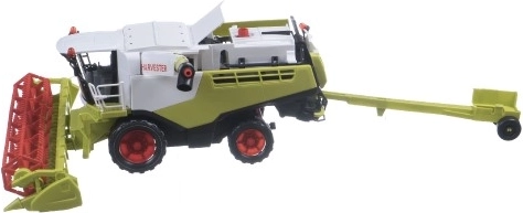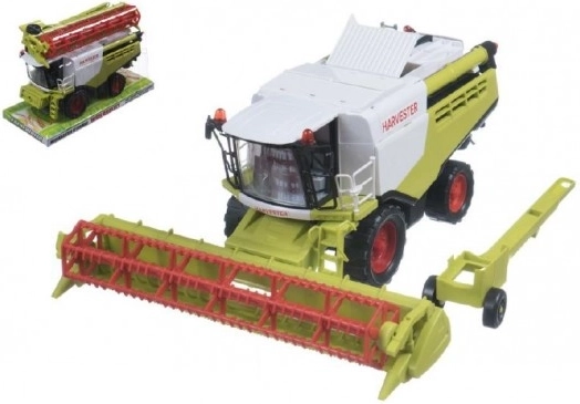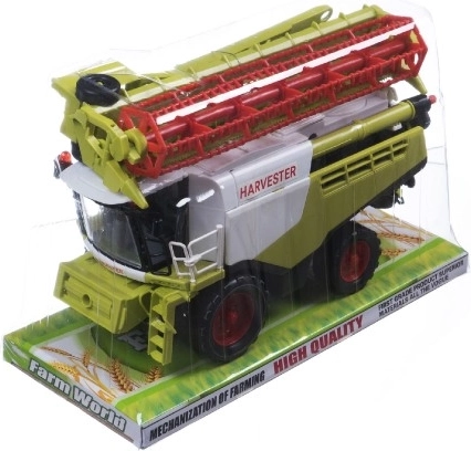 Kombajnul din plastic de 31 cm pe set de inerție este un model detaliat, în culori gri-verde, care copiază fidel tehnologia agricolă reală. Acesta vine cu o mare lamă frontală și este echipat cu un braț lateral pentru descărcare și un trailer detașabil. **Ideal pentru copiii de peste 3 ani.**