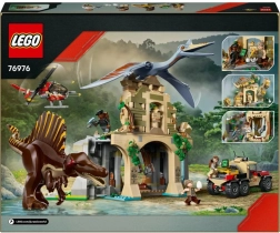 Descoperă acțiunea inspirată de film în junglă: templul antic cu cascadă ascunde un cuib cu ouă, pasaje secrete și o capcană activată cu lanț. Spinosaurus articulat (picioare, labe, coadă, cap și maxilar) și impunătorul Quetzalcoatlus (aripi și maxilar) adaugă scene realiste de urmărire și salvare.