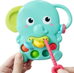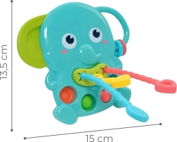 Jucăria combină stimularea senzorială cu alinarea în timpul erupției dentare. Texturile diverse și butoanele glisante dezvoltă gândirea logică și precizia mișcărilor, în timp ce inelele mobile de pe trompă implică văzul și auzul. Aspectul prietenos al elefantului îi motivează pe cei mici să exploreze independent și să se joace cu bucurie.