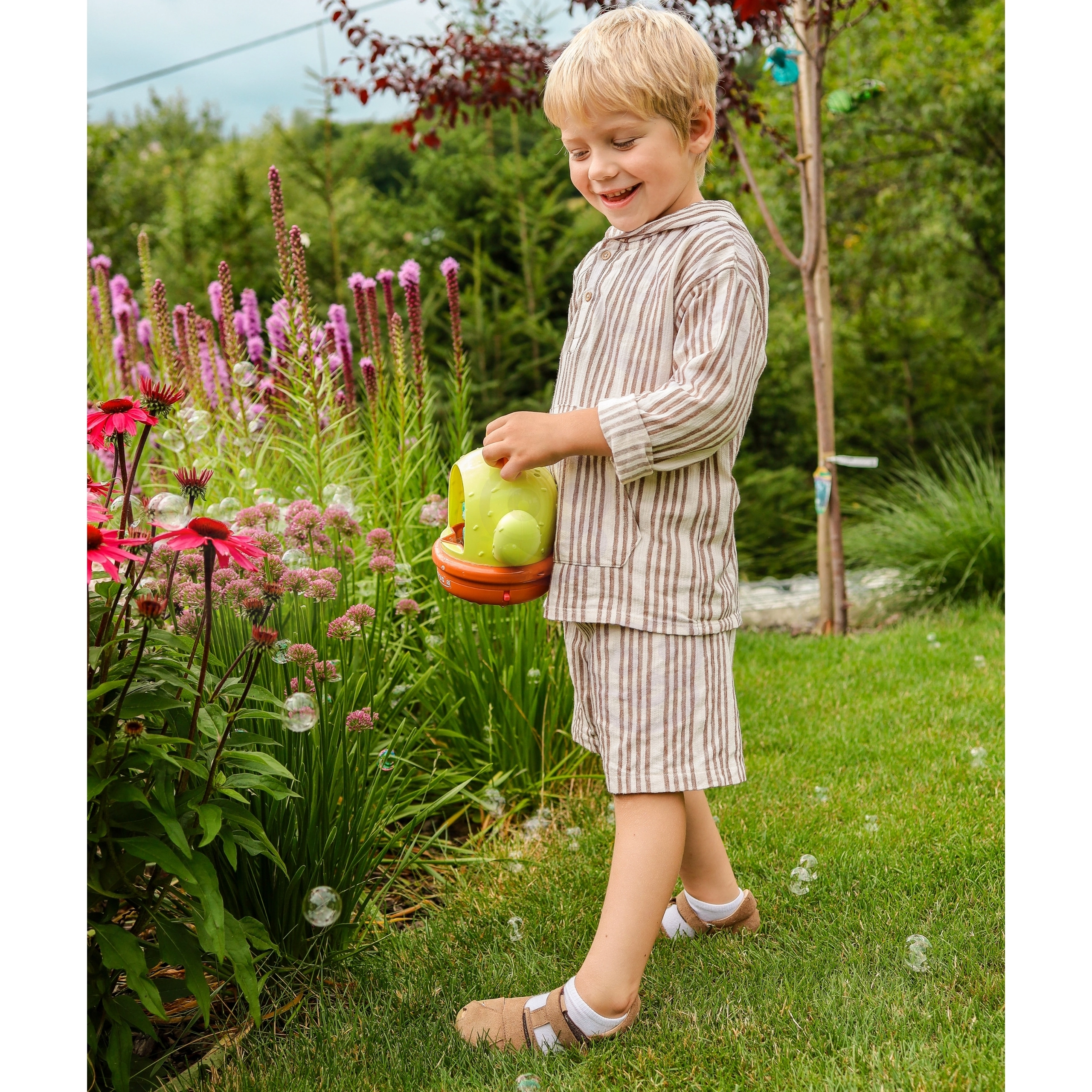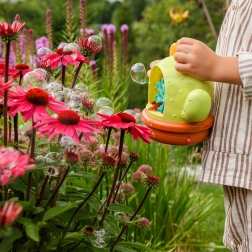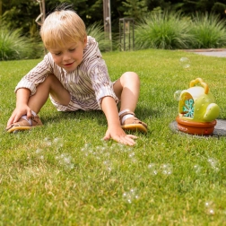Jucăria este completată de lumini colorate și efecte sonore, care implică și mai mult în joacă și stimulează imaginația. Recipientul etanș previne vărsarea soluției, iar datorită mânerului comod copiii pot lua ușor mașina de baloane în grădină, la locul de joacă sau la bunici.