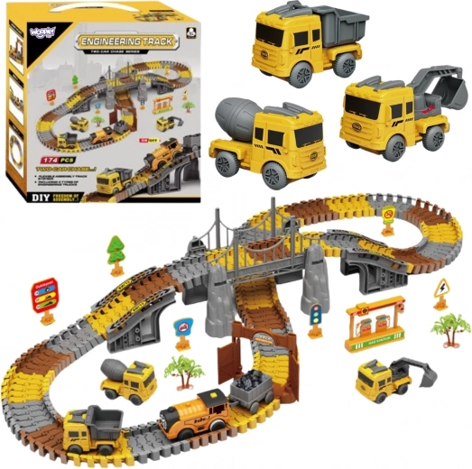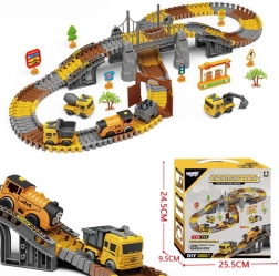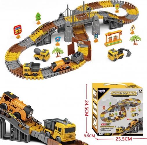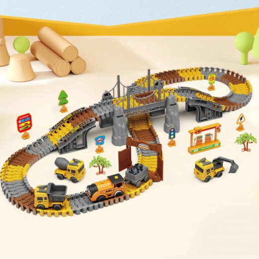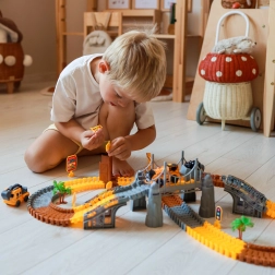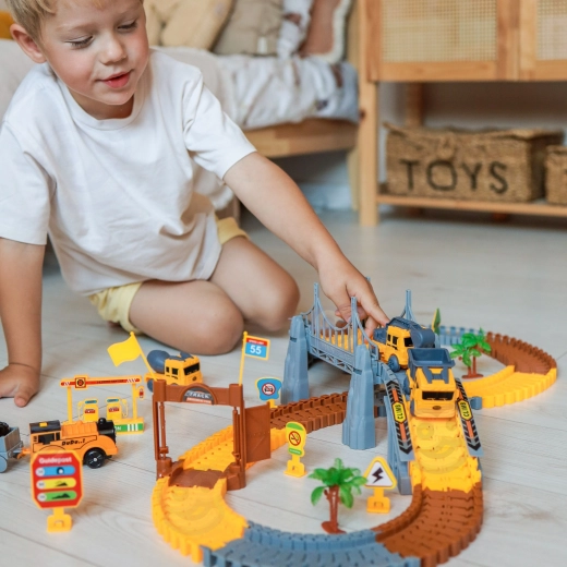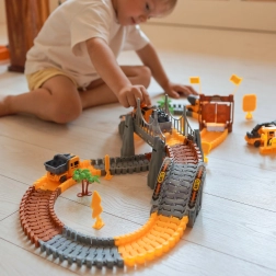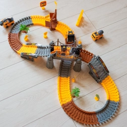 Acest set mare îmbină lumea trenulețelor și a pistei de curse într-un singur joc distractiv. Datorită pieselor elastice, care se prind între ele, copilul creează ușor linii drepte, curbe, rampe și secțiuni de pod. Atmosfera realistă este completată de utilaje de construcții, porți, indicatoare și alte decorațiuni care stimulează imaginația și jocul independent.