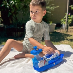 Împinge puțin nava și aceasta pornește înainte datorită mecanismului cu fricțiune. Ideală pentru joc pe covor sau podea. Jucăria nu plutește.