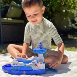 Pornește în misiuni pline de acțiune cu nava de patrulare polițienească de la Woopie la scara 1:16. Setul distractiv include o navă mare cu părți mobile și trei mașinuțe metalice pentru și mai multe scenarii de joc. O experiență realistă este asigurată de efecte luminoase și sonore, iar puntea rabatabilă, rampa și ușile laterale nu lipsesc, la fel nici mecanismul cu fricțiune pentru deplasare pe uscat. Ideală pentru micii fani ai intervențiilor de salvare și ai acțiunilor polițienești. Jucăria se deplasează, nu plutește.