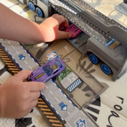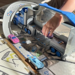 Camionul funcționează ca transportor mobil și ca geantă portabilă pentru mașinuțe și accesorii. Copiii pot lua ușor întregul set oriunde cu ei.