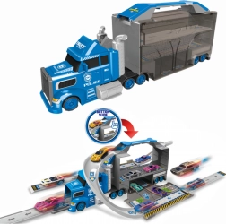 Marele camion de poliție de la WOOPIE se transformă în câteva clipe dintr-o unitate de transport pentru mașinuțe într-un set complet de curse cu garaj și pistă. La deschiderea remorcii se dezvăluie zona interioară de joacă cu rampe, bucle și indicatoare, unde copiii pot organiza curse și dueluri captivante.