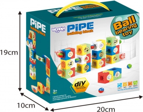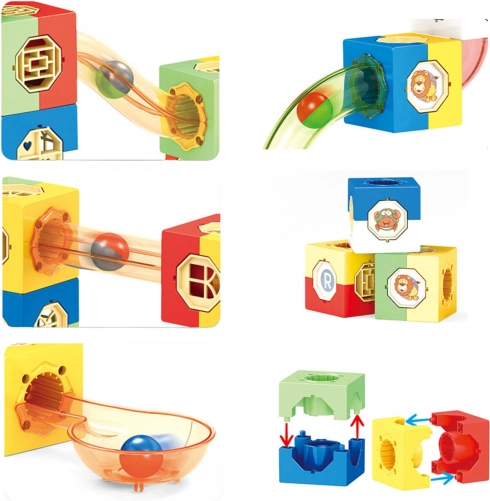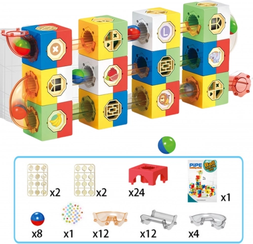 Acest set creativ le permite copiilor să proiecteze și să reconstruiască labirinturi originale pentru bile după propria imaginație. Datorită combinației de cuburi, segmente drepte, piese în pantă și tuburi transparente, urmărirea traseului bilelor este captivantă și educativă – dezvoltă logica, motricitatea fină și gândirea spațială.