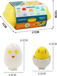 Fiecare ou este format din două părți: coaja superioară și coaja inferioară unite printr-o figurină de pui. Copiii trebuie să se concentreze nu doar să potrivească coaja corectă, dar și să o plaseze în locația corespunzătoare pe suport. Fiecare ou are un design geometric unic pe partea inferioară, care se potrivește într-un anumit orificiu al cutiei. Fețele amuzante sunt o modalitate excelentă de a învăța copiii să recunoască și să numească emoțiile.