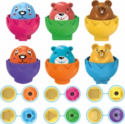Acest set conține șase ouă colorate, în interiorul cărora veți găsi animăluțe vesele. Sarcina copilului este nu doar să deschidă oul, ci mai ales să pune oul la locul potrivit în aranjamentul special. Fiecare ou are în partea de jos o formă geometrică unică, care corespunde unei deschideri în ambalaj. La apăsarea figurinei animăluțelor se aude un efect sonor. Fețele vesele de pe coajă sunt o modalitate excelentă pentru a învăța copiii să recunoască și să denumească emoțiile.